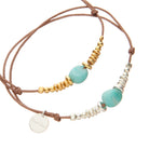 Pulsera hecha a mano en hilo ajustable color arena, con entre piezas en Plata de Ley ó Plata de ley chapadas en oro, y piedra Amazonita natural central.
