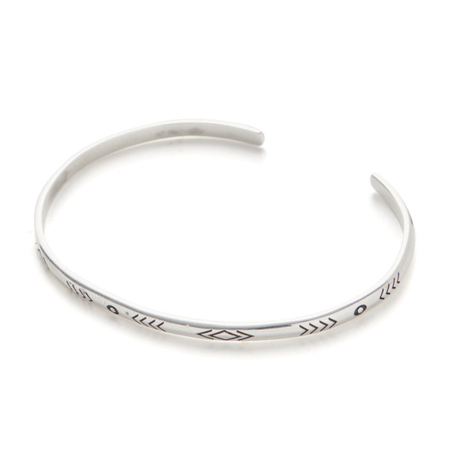 Pulsera rígida trabajada en Plata de Ley oxidada, pátina oscura que se le da a la plata 925 para crear un efecto envejecido que de profundidad al dibujo.