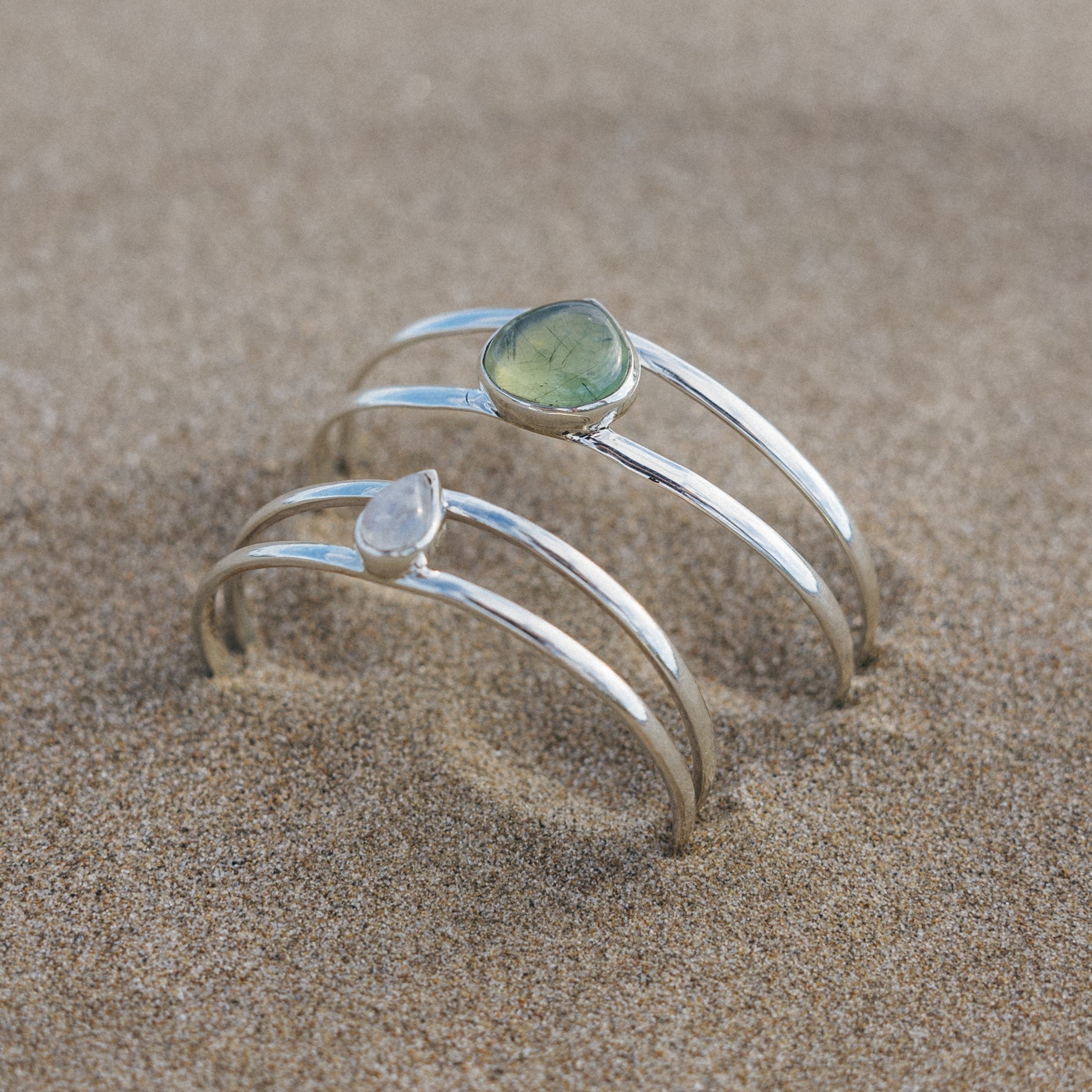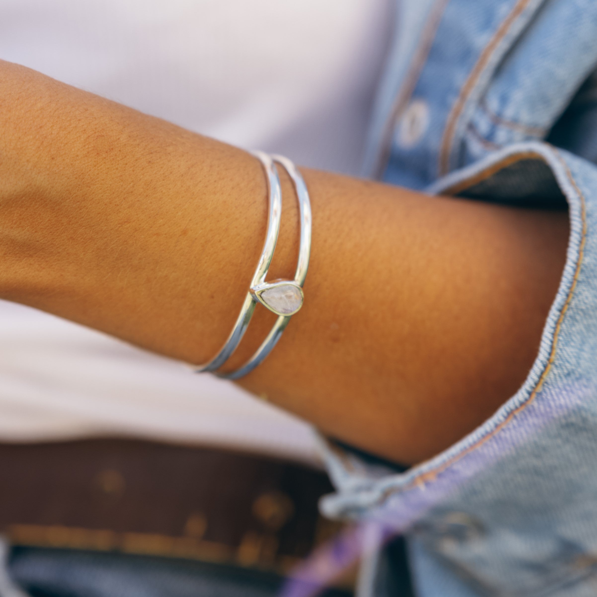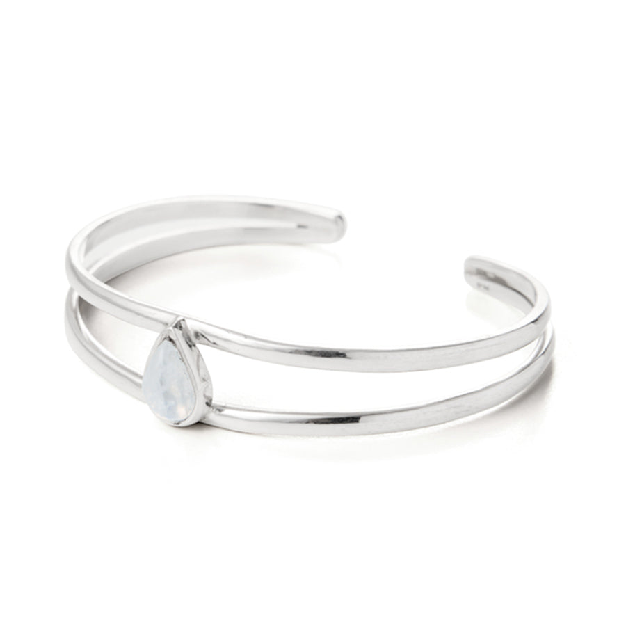 Pulsera rígida con doble perfil de plata y piedra Luna natural central en forma de lágrima de aproximadamente 12 x 8mm.