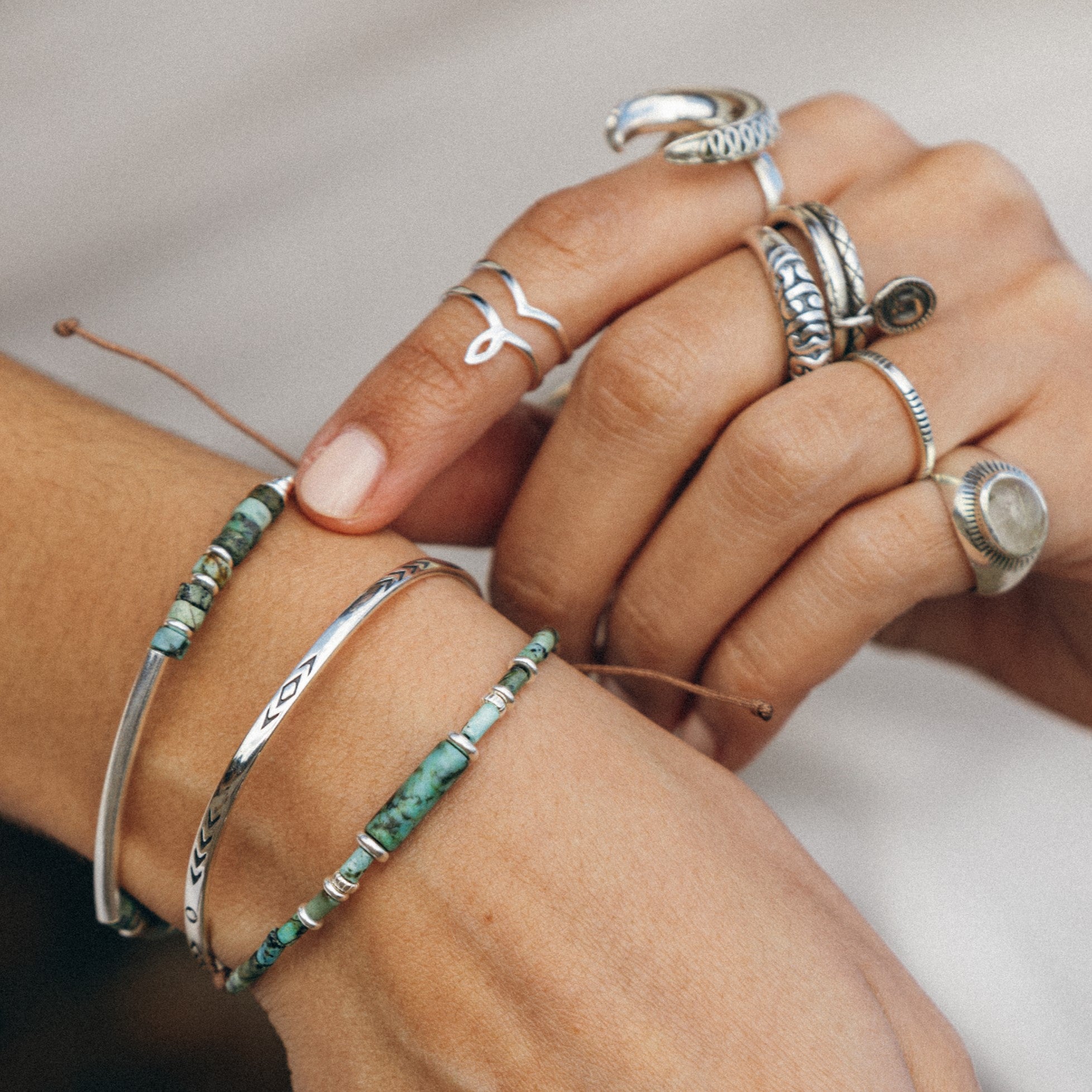 Pulsera hecha a mano con piedrecitas Turquesas naturales, entre piezas en plata de ley ó en plata de ley con baño de oro, y pieza central en forma de tubo también en piedra turquesa.