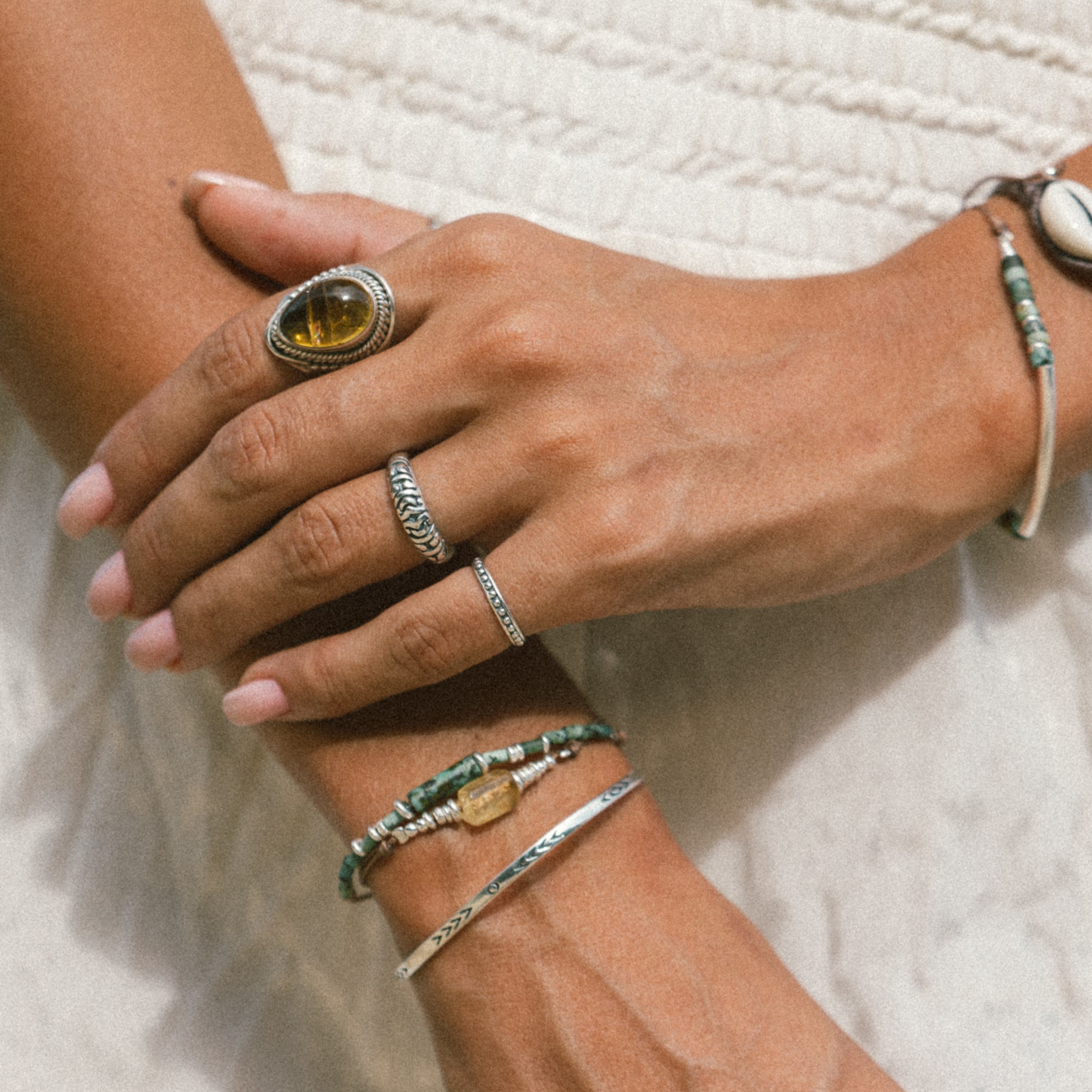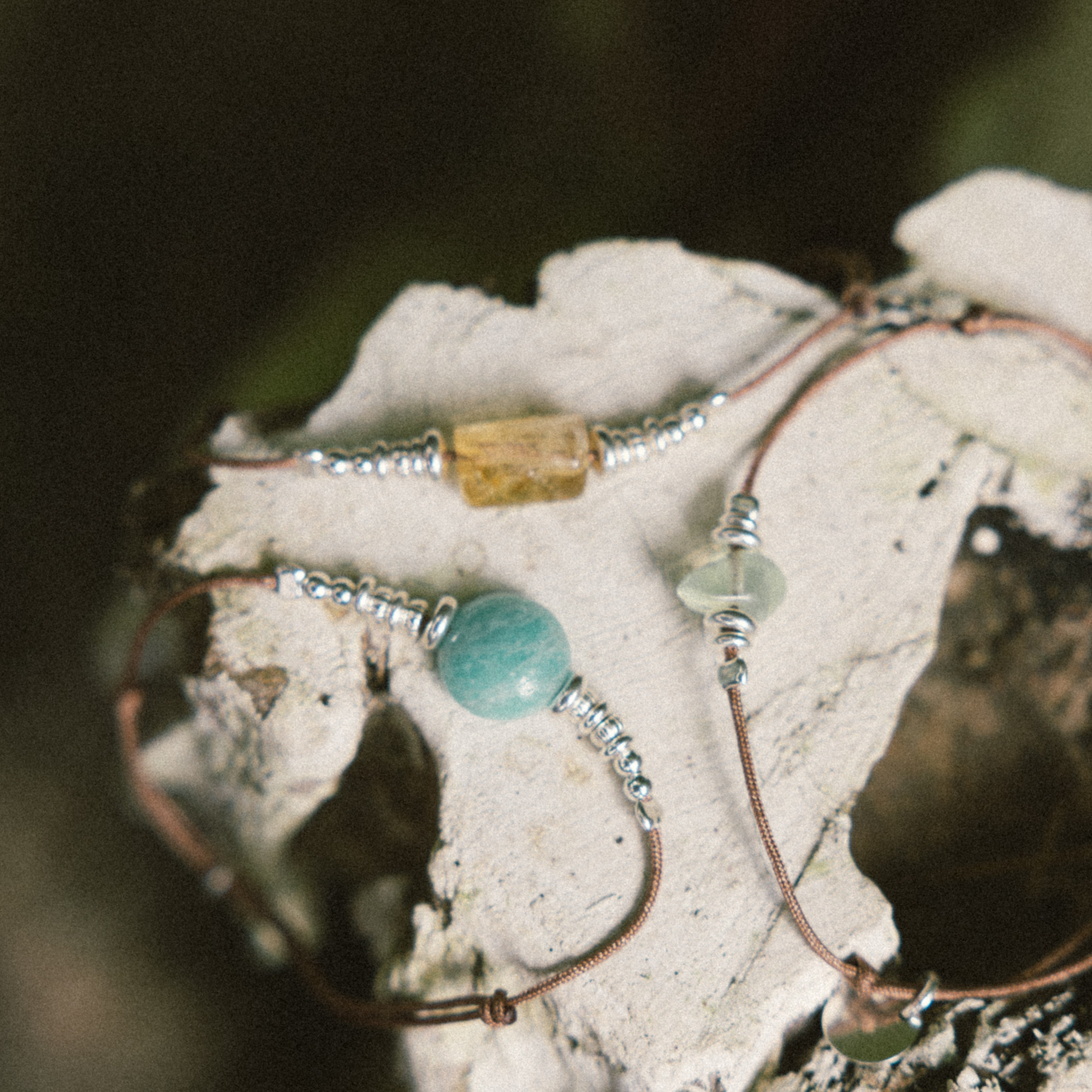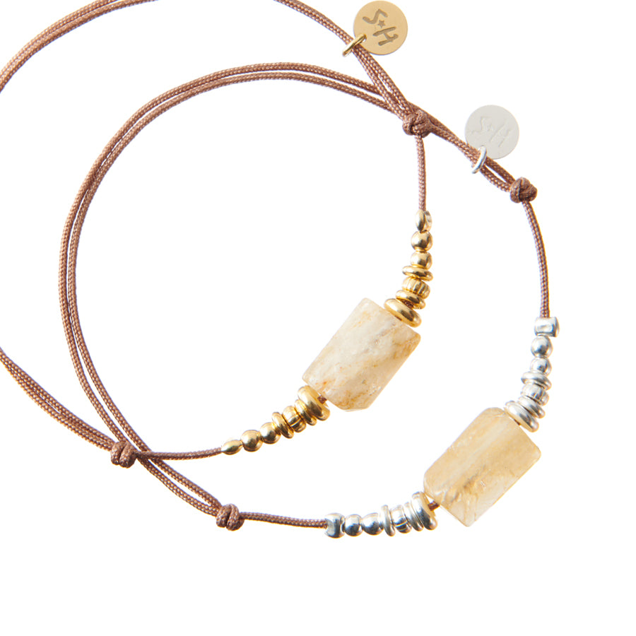 Pulsera hecha a mano en hilo ajustable color arena, con entre piezas en Plata de Ley ó Plata de Ley chapadas en oro y piedra Citrino natural central.