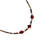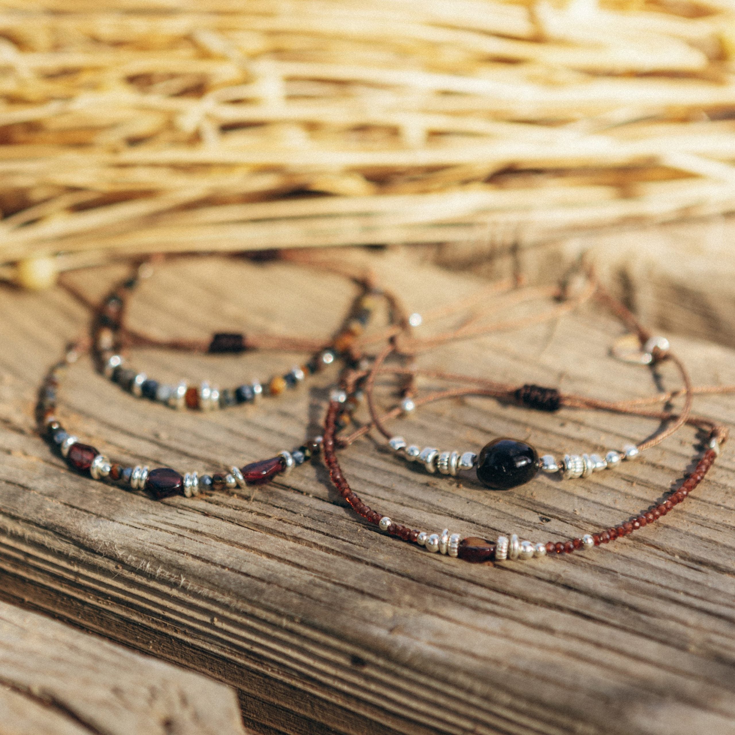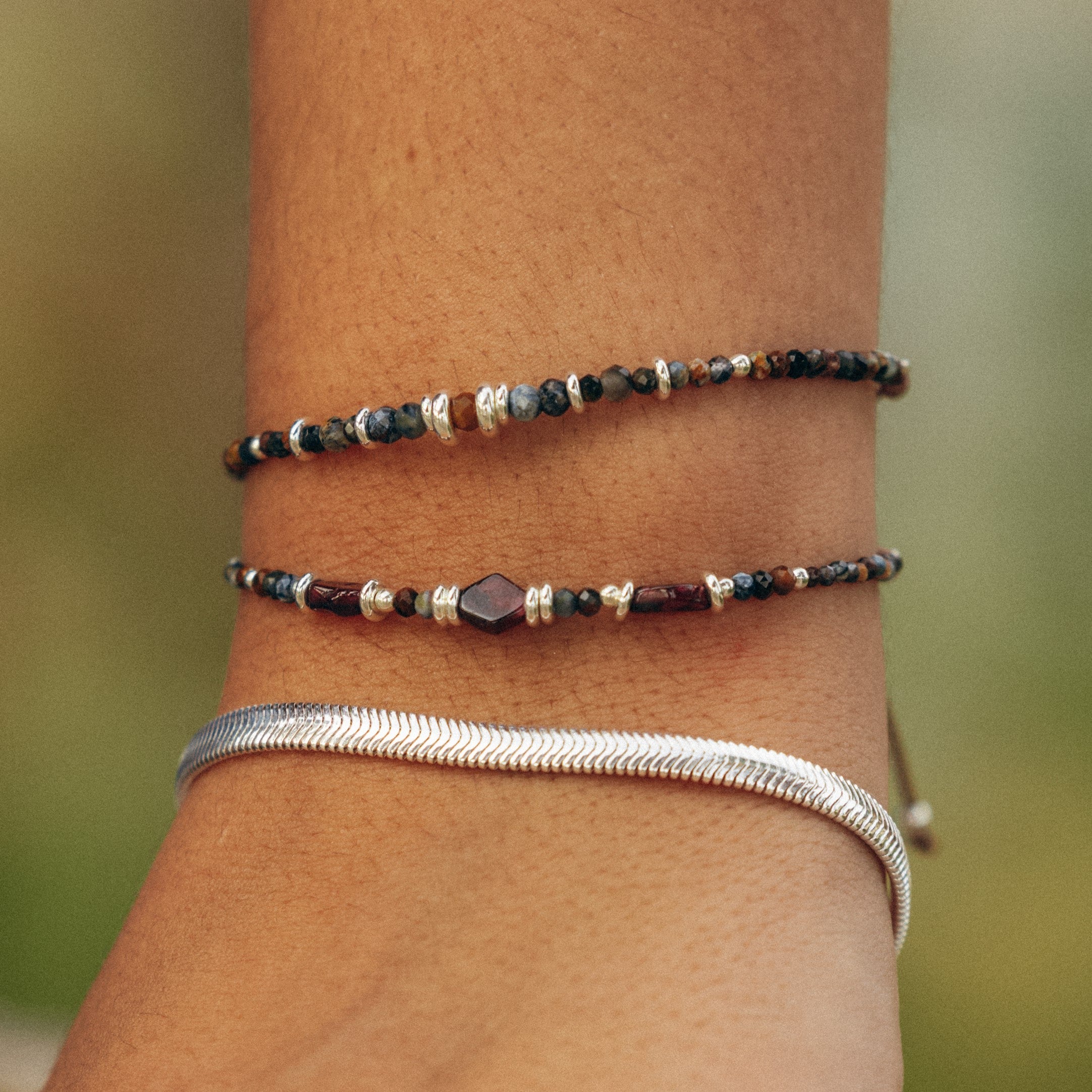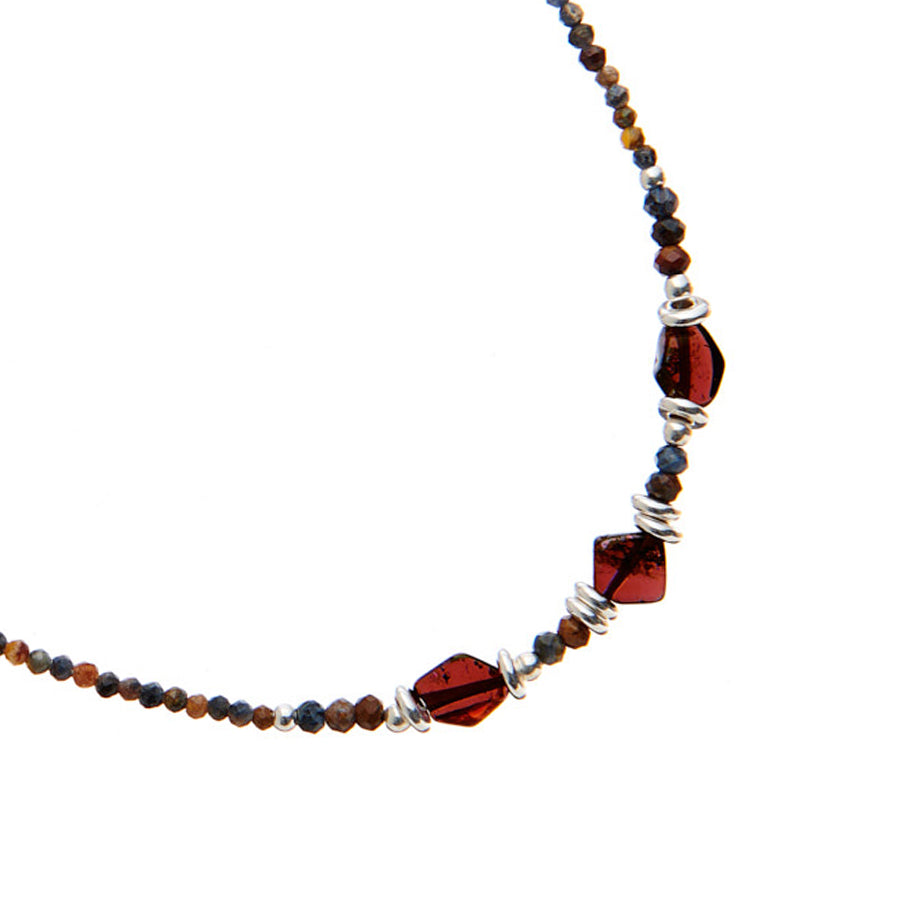 Pulsera hecha a mano con piedrecitas Pietersita natural de distintos tamaños, entre piezas en plata de ley y tres piedras Granates centrales en forma de rombo.
