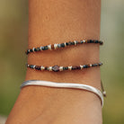 Largo de pulsera: Talla única (ajustable). Con terminación en hilo y nudo corredizo a lado y lado de la parte central de piedrecitas.