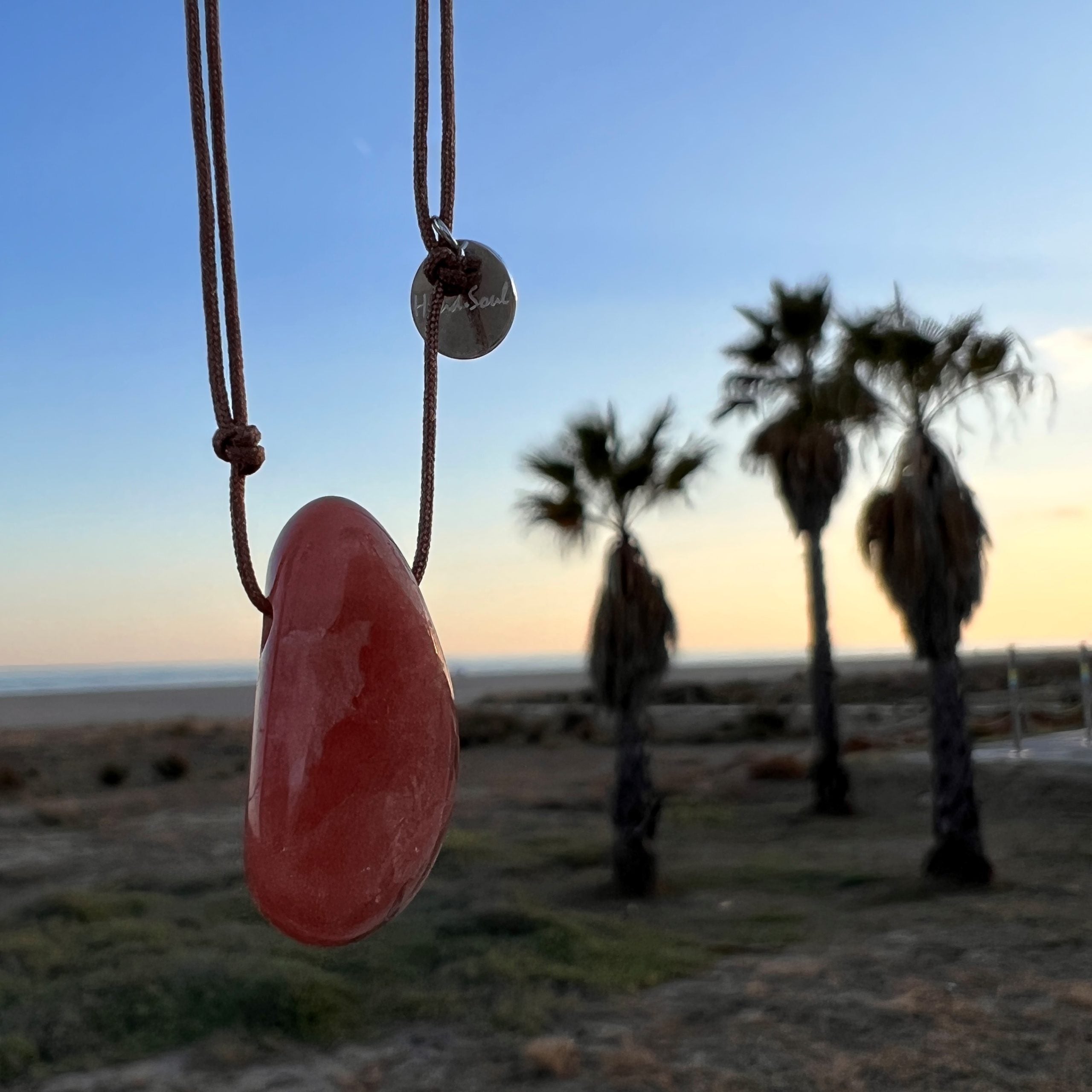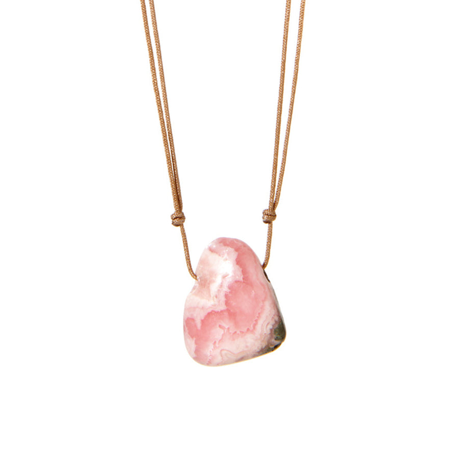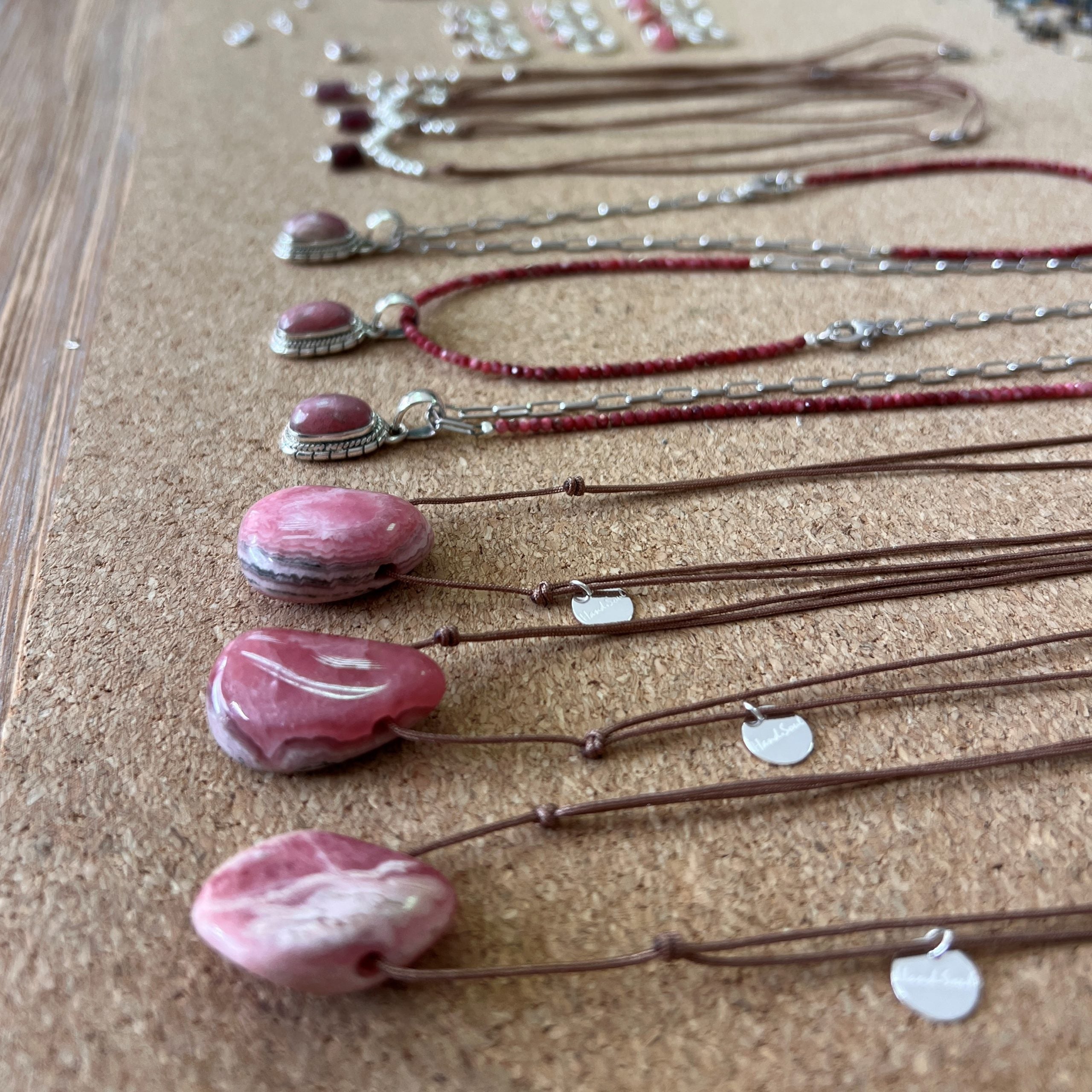 Collar de hilo ajustable hecho a mano con piedra Rodocrosita natural en forma de lágrima.