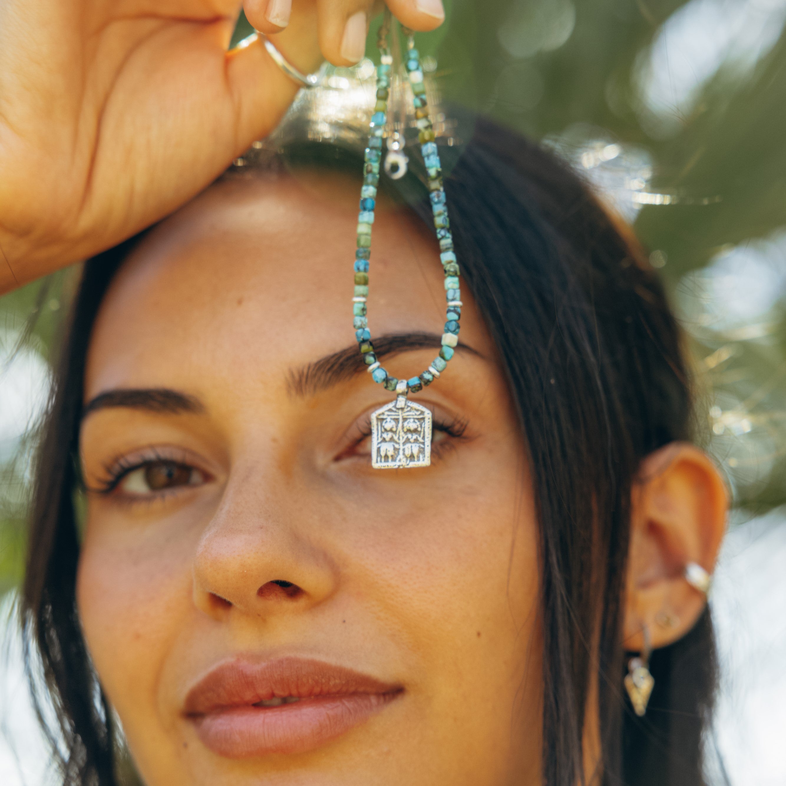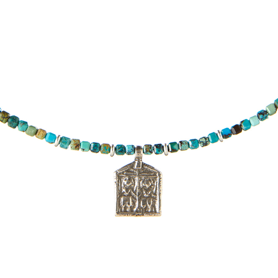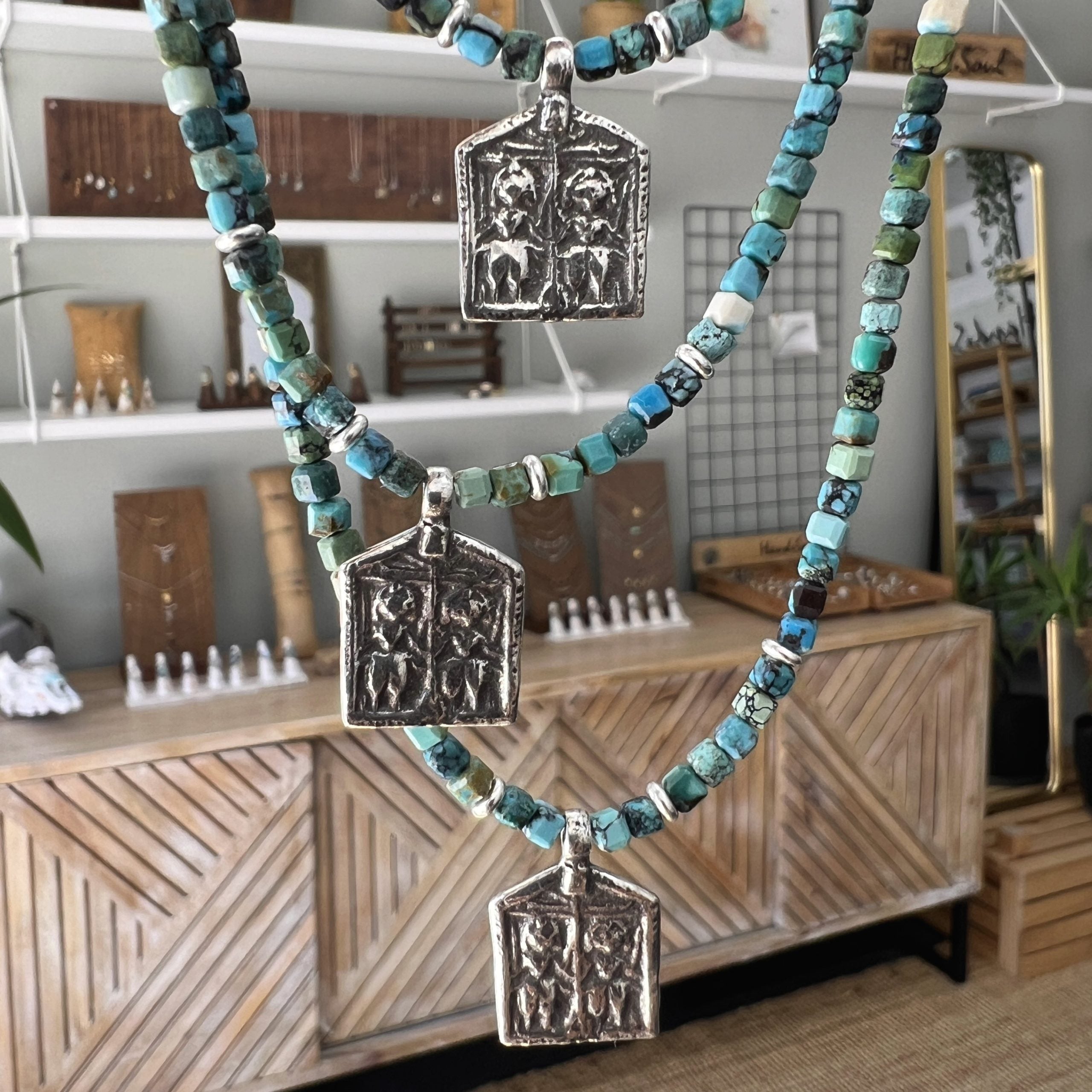 Gargantilla hecha a mano con piedras turquesa cuadradas de aproximadamente 3mm de diámetro, entre piezas en plata de ley y colgante central trabajado en base de bronce y posteriormente bañado en Plata de Ley envejecida para darle el toque rústico a la pieza.