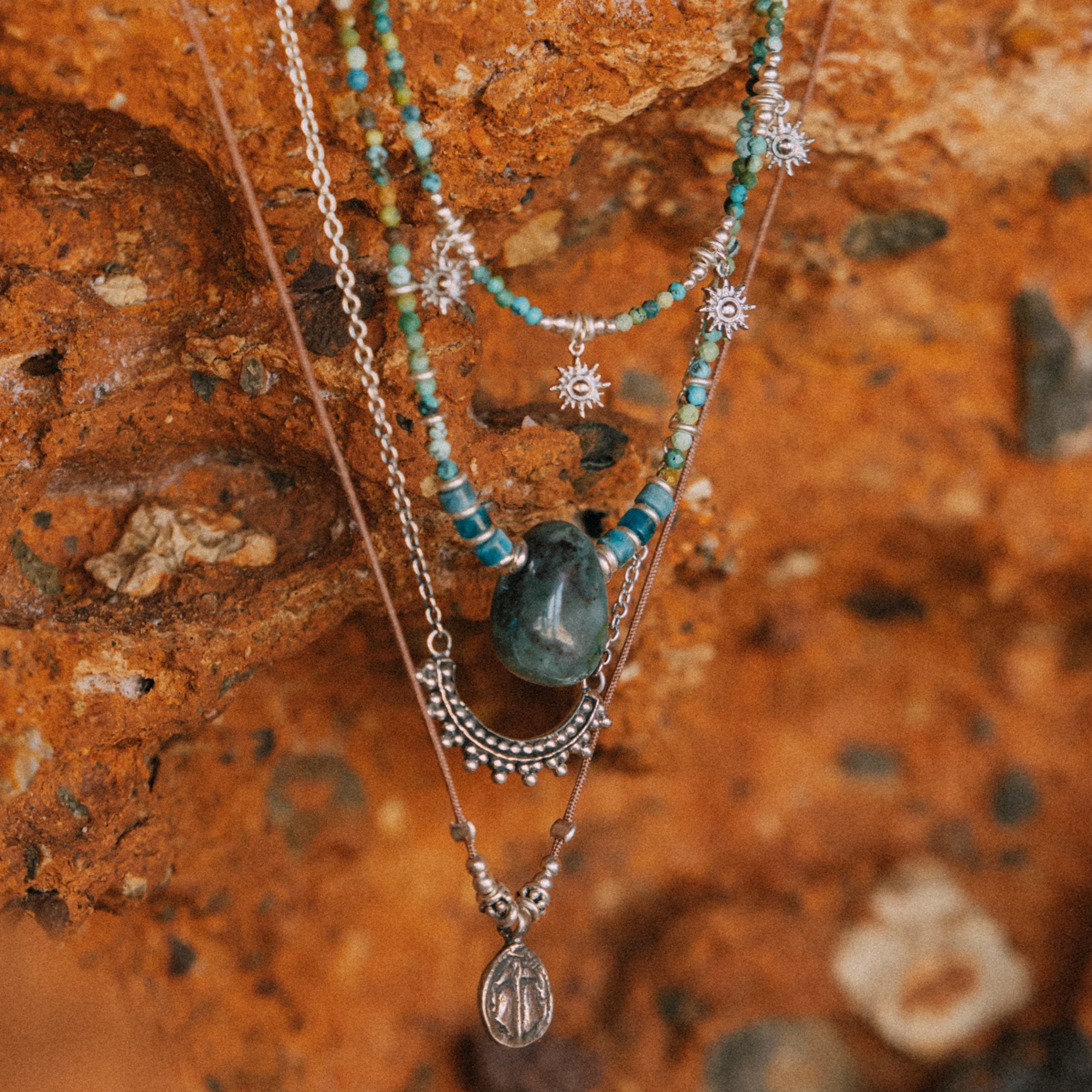 Gargantilla hecha a mano con piedra Turquesa y entre piezas y soles trabajados en plata de ley.