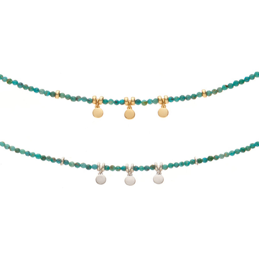 Gargantilla hecha a mano con piedra Turquesa, entre piezas en plata de ley ó plata de ley con baño de oro, y tres plaquitas lisas centrales.