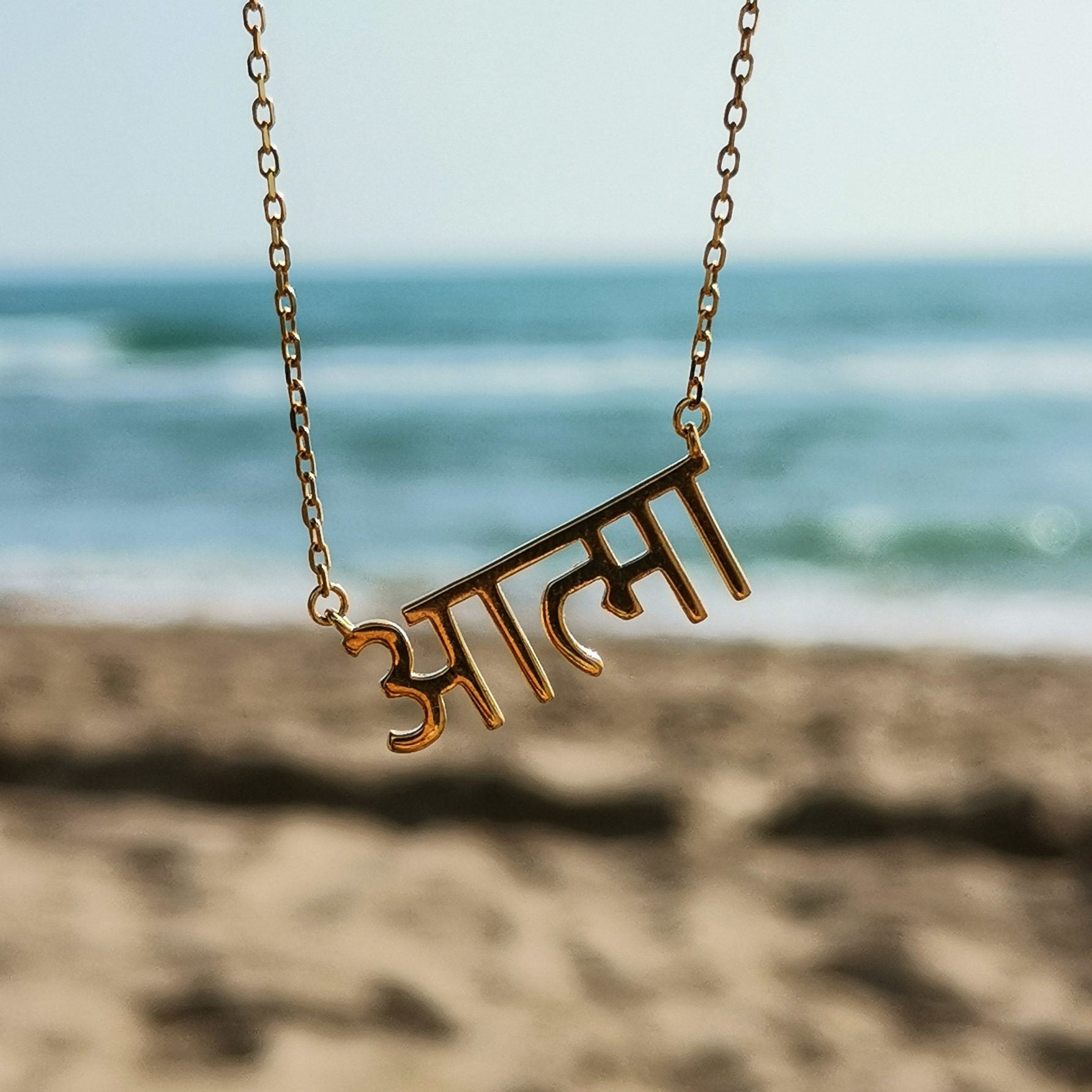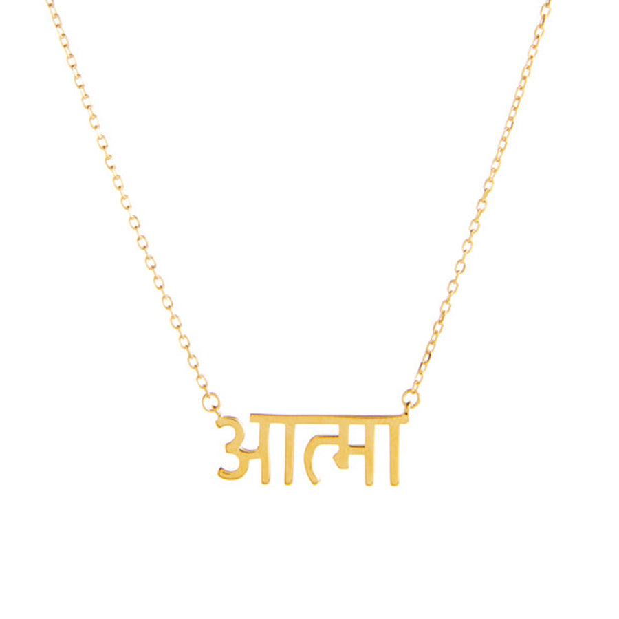 Necklace with a centerpiece with the word "ALMA" in Hindi, so important to our community.