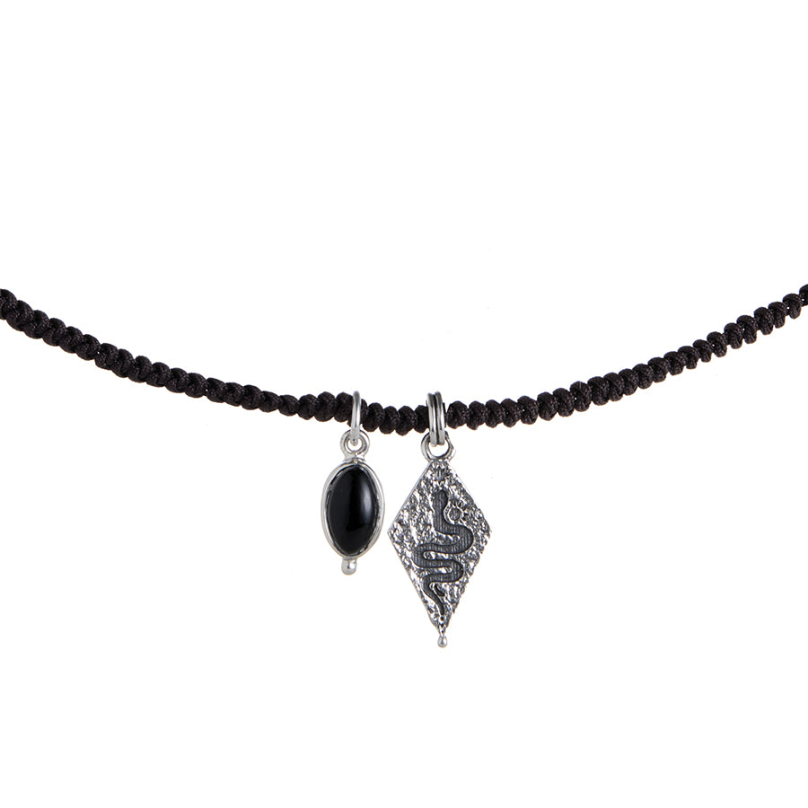 Choker trabajado a mano mediante técnica de macramé con combinación de dos colgantes centrales, el principal diseñado en forma de rombo y dibujo de serpiente acompañado con colgante en piedra Ónix negro. La pieza entera está elaborada en Plata de Ley 925 oxidada, pátina oscura que se le da a la plata para crear un efecto envejecido que de profundidad al dibujo.