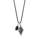 Collar largo trabajado a mano mediante técnica de macramé con combinación de dos colgantes centrales, el principal diseñado en forma de rombo y dibujo de serpiente acompañado con colgante en piedra Ónix negro. La pieza entera está elaborada en Plata de Ley 925 oxidada, pátina oscura que se le da a la plata para crear un efecto envejecido que de profundidad al dibujo.