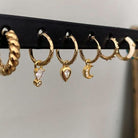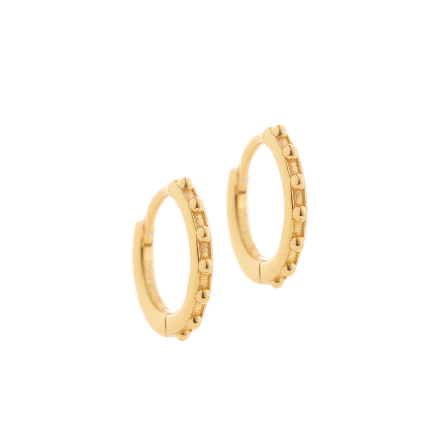 Hoop earrings with mini balls embedded along their entire length with a "click" type closure. Earring size: approximately 10 mm outer diameter. Material: 18/24K GOLD PLATED STERLING SILVER with 1 MICRON thickness. Available for purchase individually or as a pair of earrings.
