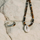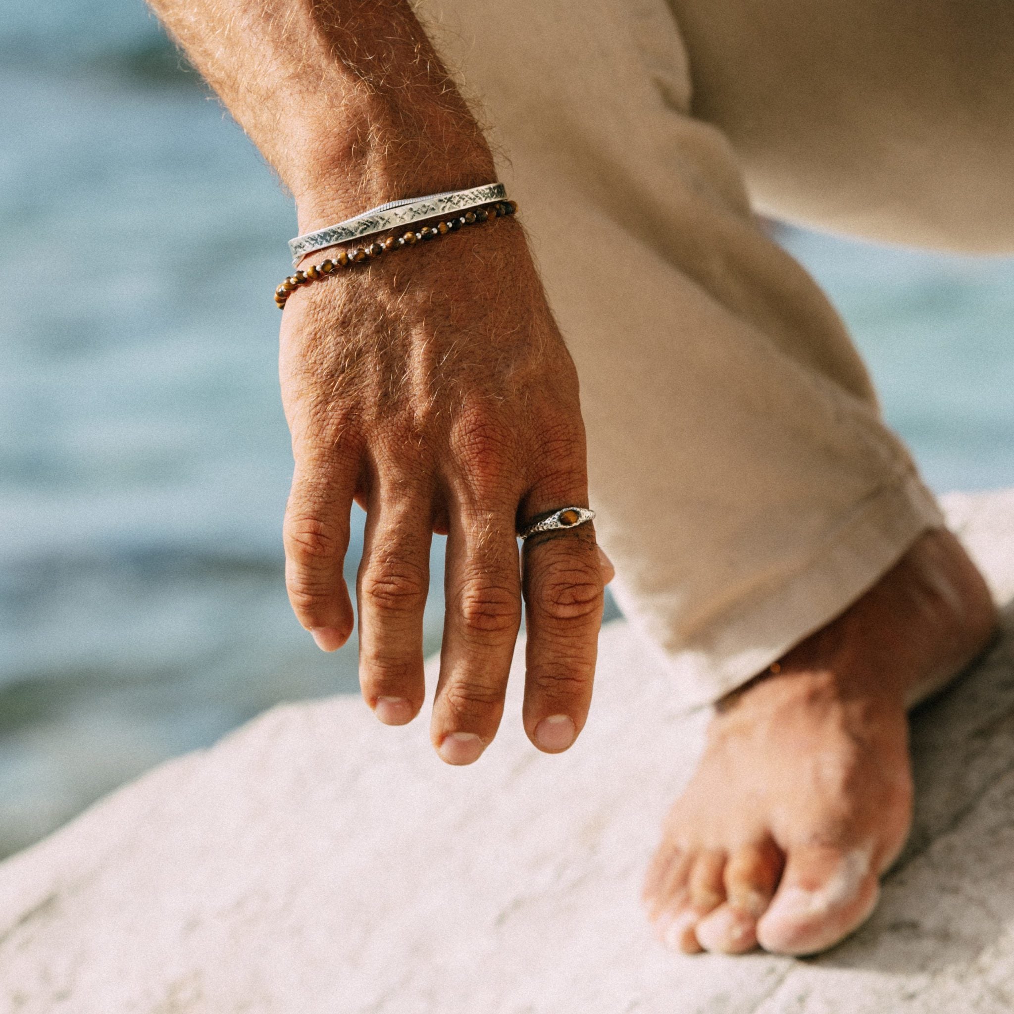 La plata golpeteada que rodea la piedra central de Ojo de Tigre evoca las texturas de la tierra, el paso del tiempo y la historia que guarda en sus capas. Cada golpe representa un desafío que enfrentamos, y como, al igual que la naturaleza, seguimos siendo fuertes y resistentes.