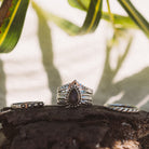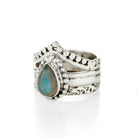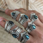Anillo con piedra Labradorita natural central en forma de lágrima de aproximadamente 2,8 cm de alto. Trabajado en Plata de Ley oxidada, pátina oscura que se le da a la plata 925 para crear un efecto envejecido que de profundidad al dibujo.